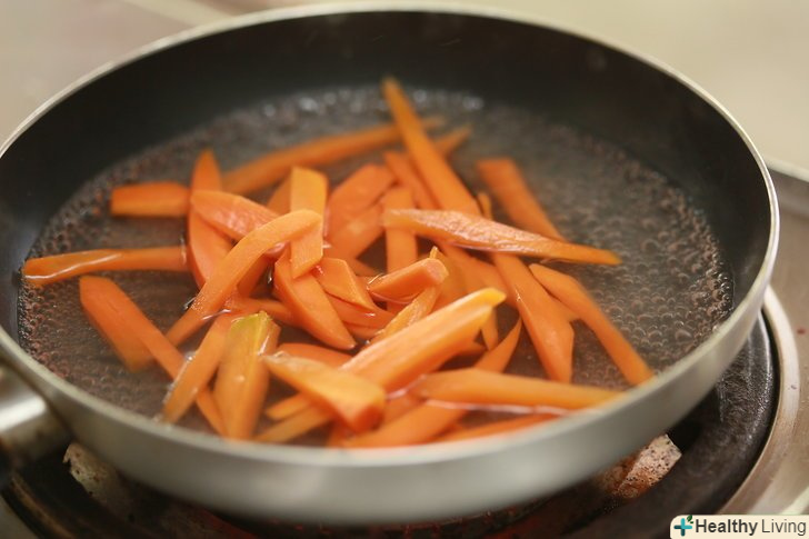 Накрийте сковороду кришкою і готуйте на повільному вогні, поки вода не випарується, а морква не приготується.при необхідності додайте більше води.- Морква, приготована таким способом, не зовсім така ж, як морква, приготована на пару, так як вона готується у воді.