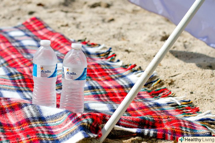 Замість солодких напоїв вибирайте освіжаючі.Забудьте про алкоголь, газовану воду і солодкі соки. Можливо, буде приємно запити обід газованою водою, проте після тривалого перебування на сонці це позначиться на вашому самопочутті.- Приготуйте лимонад або інший цитрусовий напій. Він допоможе втамувати спрагу і уникнути зневоднення.