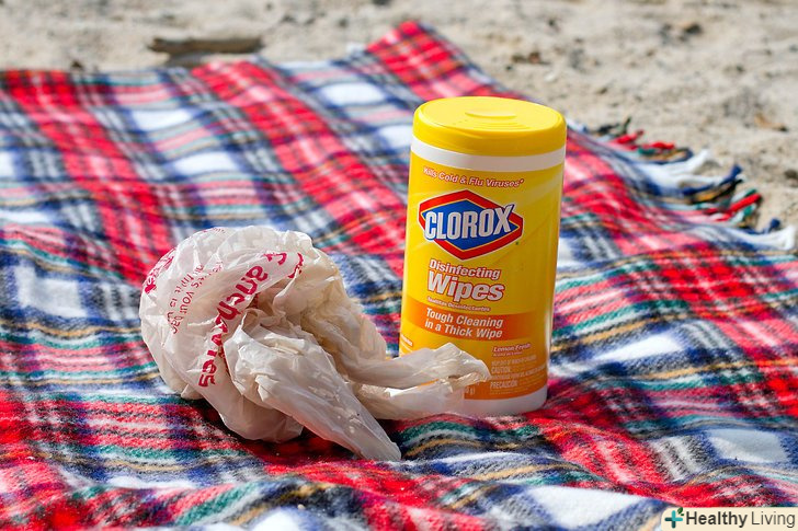 Візьміть з собою матеріали для прибирання.пісок неминуче потрапить на їжу, і навколо буде повно розлитих напоїв і крихт. Крім того, обов'язково потрібно забрати з собою упаковки і контейнери від їжі, щоб залишити пляж в недоторканому стані.- Вологі серветки дуже зручні для використання на пляжі. На відміну від сухих, вони прекрасно зволожують шкіру і краще видаляють пісок і забруднення.