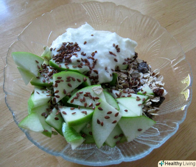- Замочіть мюслі на ніч. Змішайте в мисці 1 склянку води, йогурт і яблуко. Накрийте миску тарілкою і поставте в холодильник.