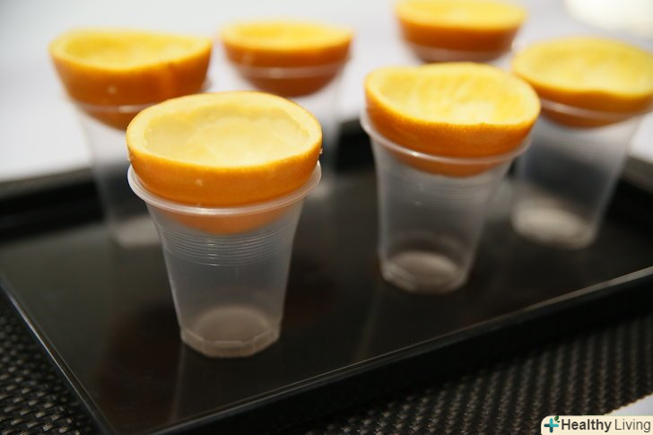 Поставте половинки з шкірки апельсинів на деко. вони повинні бути стійкими. Ви можете поставити їх на пластикові стаканчики або лоток для випікання кексів, якщо він у вас є.
