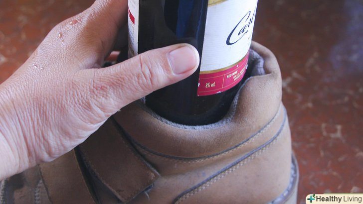 Поставте пляшку в туфлю. можна використовувати будь-які туфлі (але не туфлі на високих підборах або відкриті шльопанці), аби в них містилася пляшка вина. Поставте пляшку на дно туфлі так, щоб горлечко було звернено до вас. Притримуйте однією рукою пляшку, а другий туфлю. [9]- Акуратно вдарте підошвою туфлі об стіну. продовжуйте при цьому притримувати пляшку і туфлю. Стукніть туфлею об стіну кілька разів. При цьому пляшку слід тримати горизонтально і стукати об стіну тією ділянкою підошви, за яким розташоване дно пляшки. Туфля захистить пляшку від пошкоджень, і після декількох ударів пробка почне подаватися назовні. [10]