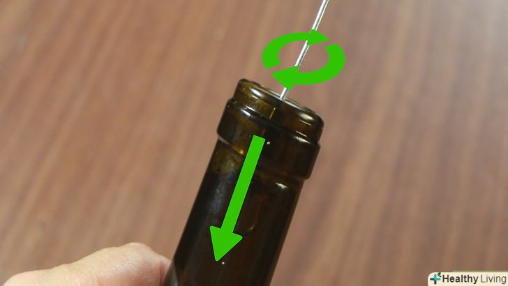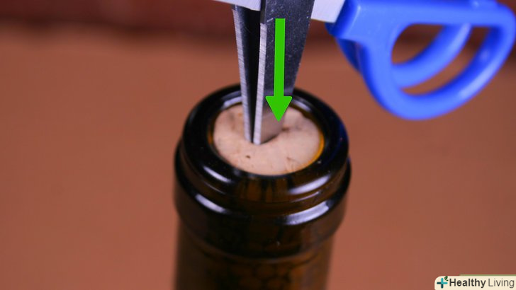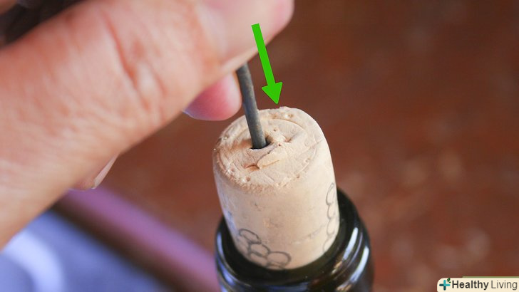 Вставте більш вузький край леза в центр пробки. трохи натисніть на ножиці, так щоб лезо наполовину увійшло в пробку. Будьте обережні, щоб не проштовхнути пробку в пляшку або не зруйнувати її. [22]- Покрутіть ручку ножиць і потягніть її вгору. міцно утримуйте пляшку однією рукою і покрутіть ножиці. Можна також замість ножиць обертати пляшку. Якщо ви досить глибоко пророби лезо в пробку, то вона подасться разом з ним, і ви зможете витягнути її до кінця голими руками. [23]