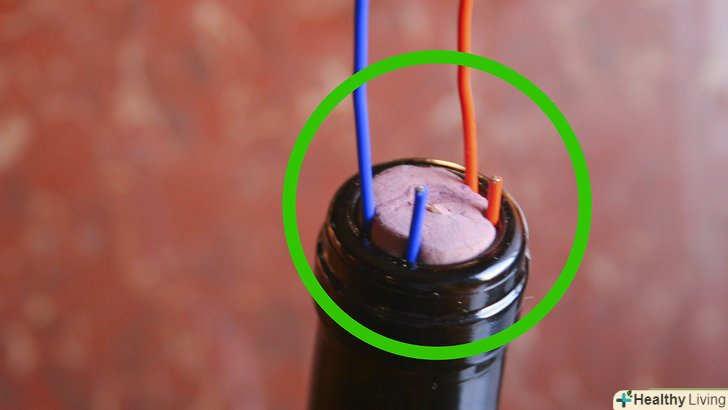 Вставте одну скріпку між пробкою і склом. протягніть одну скріпку збоку пробки так, щоб вигин у вигляді букви U виявився всередині пляшки під пробкою, а випрямлений кінець залишився зовні. Після цього розгорніть скріпку на 90 градусів, щоб вигин повернувся всередину пляшки і опинився під центром пробки. [18]- Протягніть таким же чином другу скріпку з іншого краю пробки.