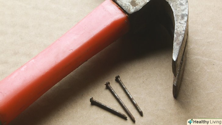 Знайдіть 3 коротких цвяха і молоток. найкраще підійдуть цвяхи, які мають приблизно таку ж довжину, як пробка.- Акуратно вбийте цвяхи в пробку. забийте їх уздовж пробки так, щоб їх капелюшки розташовувалися уздовж прямої лінії. Забивайте цвяхи поблизу один від одного. Не бийте молотком занадто сильно, щоб пробка не розкришилася. [20]