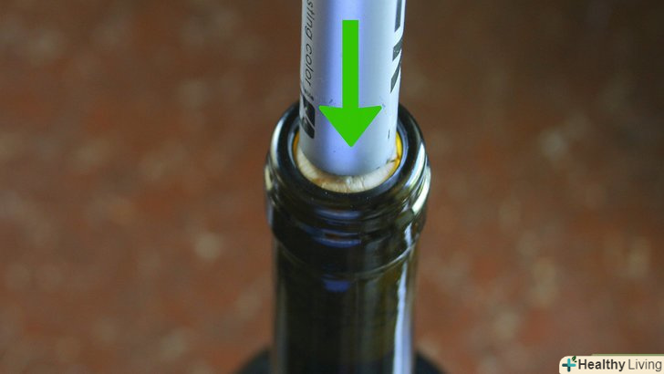 Упріть обраний предмет в пробку. як правило, пробка злегка втоплена в шийку пляшки. Якщо ж поверхня пробки знаходиться на одному рівні з краєм шийки, натисніть на неї, щоб вона трохи осіла. Це допоможе вам утримувати предмет на пробці, і він не вислизне за межі горлечка.- Втисніть пробку всередину пляшки. не направляйте пляшку на оточуючих, так як з неї може бризнути вино. Візьміться однією рукою за пляшку, а другий за використовуваний предмет і сильно натисніть їм на пробку, щоб вона увійшла всередину пляшки. При цьому з пляшки може виплеснутися трохи вина. [4]