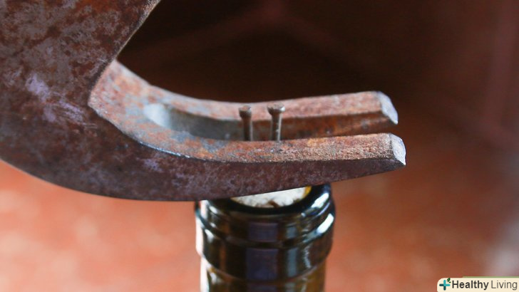 Захопіть роздвоєним кінцем молотка капелюшки цвяхів. протягніть його під капелюшки, щоб можна було витягнути їх.- Витягніть цвяхи разом з пробкою. просто потягніть вгору молоток і витягніть пробку. При цьому можна злегка похитувати молотком, щоб пробка легше виходила з пляшки. Можна також залишити молоток з цвяхами на місці і крутити саму пляшку, поки пробка не вийде з неї. [21]