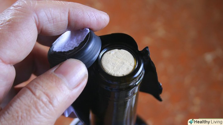 Зніміть з пробки захисне покриття. простежте за тим, щоб пробку не прикривала пластмаса або фольга. Повинна залишитися лише пляшка і пробка. Щоб зняти верхню кришку, просто потягніть її вгору. Якщо вона не зісковзнула, пошукайте, чи немає петельки, за допомогою якої Ви легко зможете відокремити верхню частину кришки. Можна також акуратно зрізати верхній край кришки ножем. [8]
