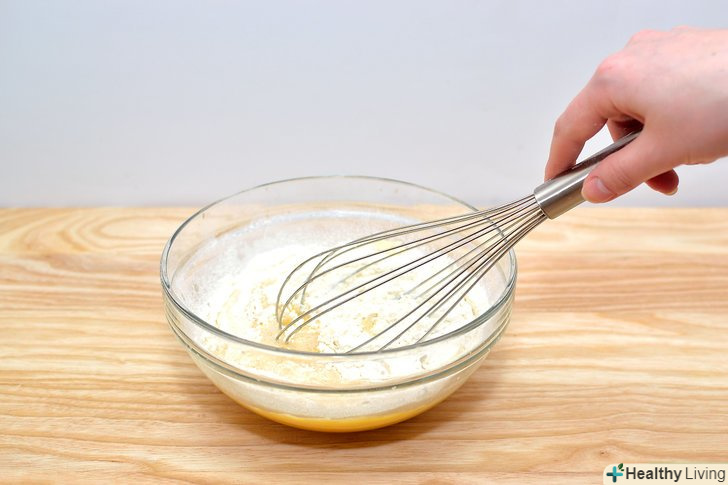 Просійте борошно в суміш. добре перемішайте віночком до отримання рідкої грудкуватої маси..
