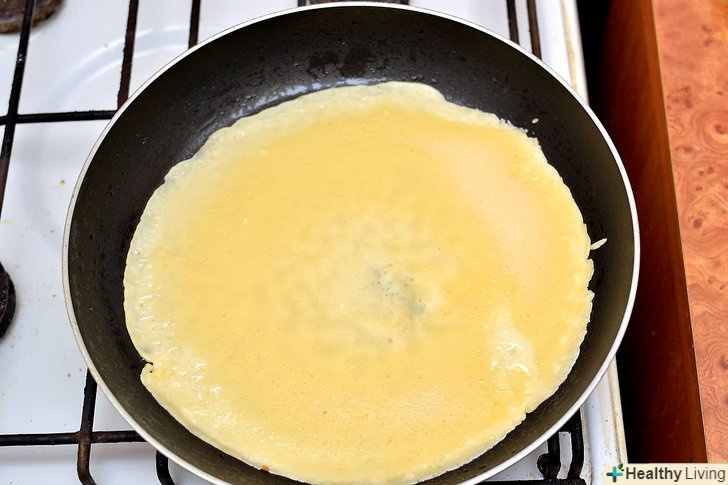 Розтопіть невелику кількість вершкового масла на сковороді. Налийте ложку тіста і печіть млинець на середньому вогні.- Переверніть млинець, коли на поверхні будуть з'являтися бульбашки, а краї стануть щільними.