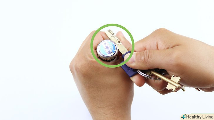 Знайдіть ключ з твердого металу, наприклад ключ від автомобіля, і піднесіть його до зубців пробки. Ключ від шафки або алюмінієвий ключ від дверей не підійдуть для зняття пробки. Виберіть великий негнучкий ключ, наприклад від автомобіля. Постарайтеся знайти ключ, у якого багато зубців, щоб було легше підсунути його під спідницю пробки. [2]- Подденьте пробку ключем. натискайте ключем вгору, виробляючи крутні рухи провідною рукою, поки пробка не відкриється. Приблизно такі ж рухи ви робите, коли заводите автомобіль. Зачепивши ключем зубці пробки, ви зможете легко розкрити пляшку! [3]
