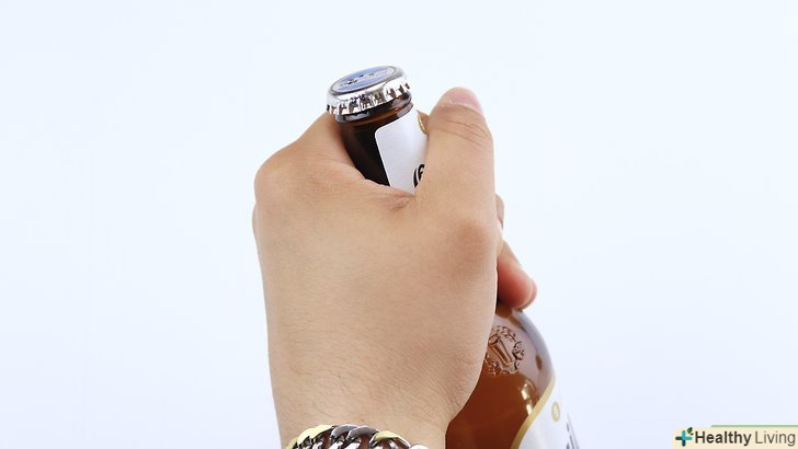 Візьміть пляшку за горлечко лівою рукою, якщо ви правша, і навпаки — якщо ви лівша. Тримайте пляшку міцно, щоб вона не вислизала з руки під тиском. Не потрібно стискати пляшку щосили, досить просто міцно зафіксувати її в руці. [1]