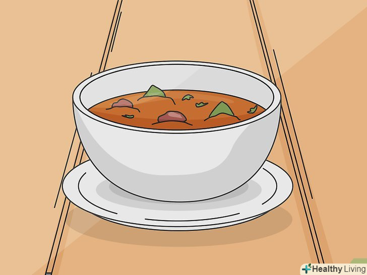 Їжте відповідну їжу. деякі запевняють, що рясний жирний сніданок або велика кількість вуглеводів допомагають «увібрати» присутній в організмі алкоголь і тим самим позбутися від похмілля. Насправді ж слід перш за все відновити запас поживних речовин. [3] Їжте відповідну їжу. деякі запевняють, що рясний жирний сніданок або велика кількість вуглеводів допомагають «увібрати» присутній в організмі алкоголь і тим самим позбутися від похмілля. Насправді ж слід перш за все відновити запас поживних речовин. [3]- Рідкі супи з бульйоном легко засвоюються і забезпечують організм поживними речовинами і натрієм.