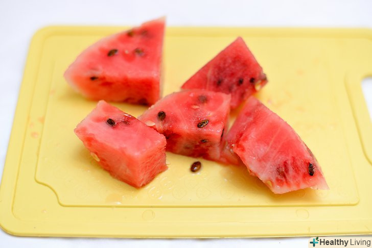 Наріжте кавун кубиками розміром в 2,5 сантиметра. видаливши шкірку, наріжте червоний плід шматочками по 2,5 см.оскільки ви будете їх варити, вони не обов'язково повинні бути рівними, а лише досить маленького розміру. [3]