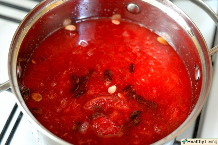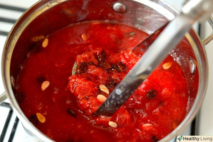 Помішуйте і розминайте кавун до тих пір, поки він не стане рідким. в процесі нагрівання кавун почне розпадатися. Щоб прискорити цей процес, роздушіть м'якоть великою ложкою і частіше помішуйте кавун. Приблизно через півгодини, коли велика частина м'якоті перетвориться в воду, приберіть каструлю з вогню. [5]