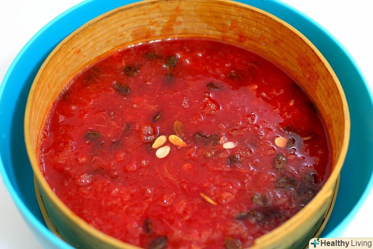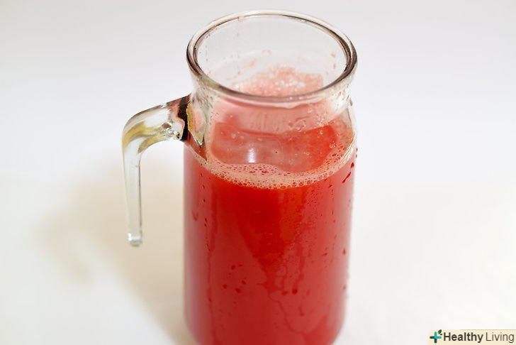 Процідіть 14 склянок кавунового соку. обережно процідіть 14 склянок (3,5 літра) кавунового соку через сітчастий фільтр, щоб виловити насіння кавуна і великі шматки м'якоті. [6]- Якщо у вас ще залишиться сік після фільтрації 14 склянок (3,5 літрів), приготуйте з нього прохолодні напої або використовуйте в коктейлях. Зберігайте залишився сік в критій ємності в холодильнику не більше трьох днів.