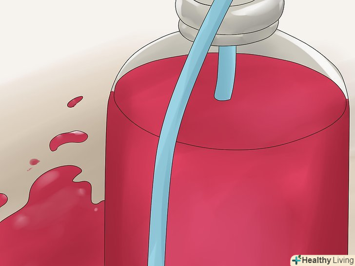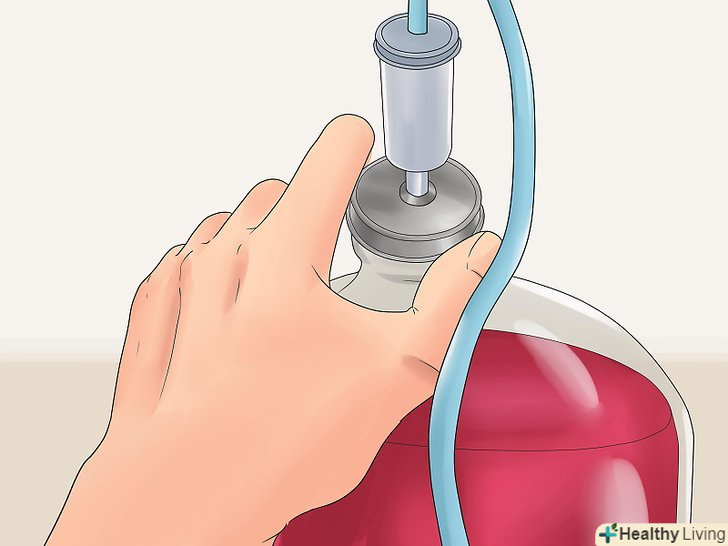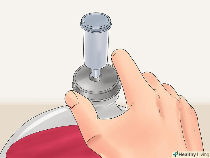 Почніть переливати вино сифоном. це зовсім нескладно: почніть втягувати вино з вільного кінця трубки, як ніби ви п'єте з соломинки, поки напій не почне текти по трубці, потім якомога швидше направте її в посудину. Ви зовсім швидко навчитеся це робити, не проливши і не наковтавшись вина, хоча останнє – не найгірший варіант.- Коли вино почне текти, миттю вставте трубку в ємність і намагайтеся, щоб воно текло спокійно. Уважно стежте за тим, щоб в трубку не потрапив осад і повітря, інакше в вино проникне багато кисню.