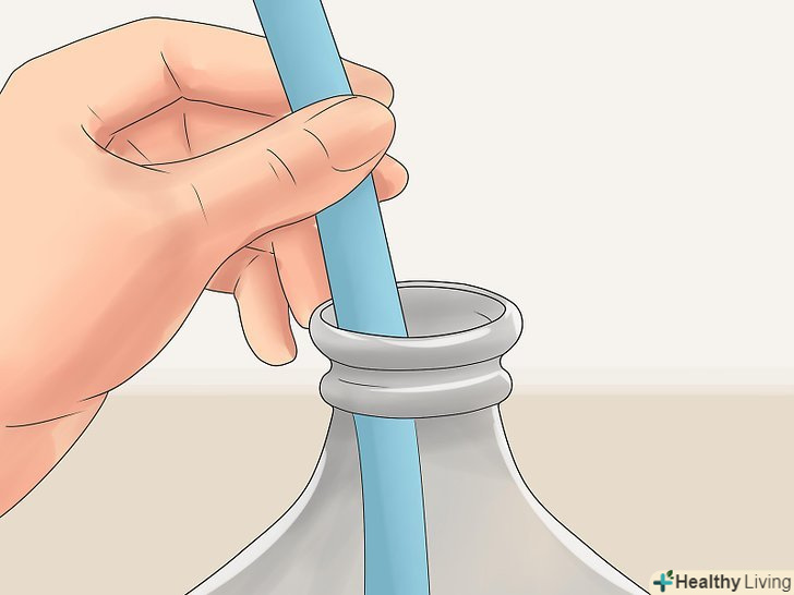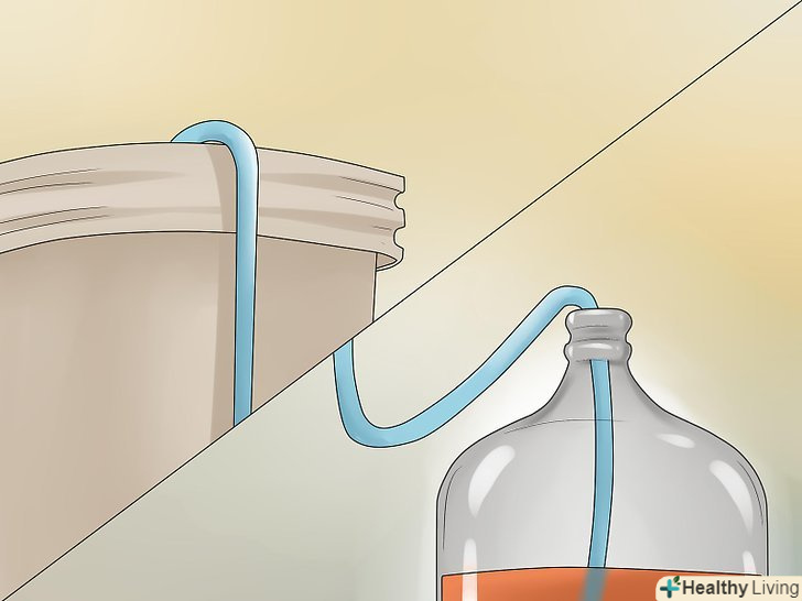 Опустіть сифон в бутель. помістіть кінець сифона з рискою в бутель, ні в якому разі не торкаючись осаду на дні. Ви повинні чітко бачити лінію осаду, перш ніж приступати до зціджування вина, вона повинна бути набагато темніше і каламутніше на дні. Трубка повинна не доходити 2,5-5 см до осаду. [2]- Помістіть інший кінець сифона в чисту ємність, куди ви будете зціджувати вино, або дозвольте йому звисати зверху. Почавши процедуру, вам доведеться швидко помістити його в ємність. Перевірте, що трубка дістає до неї.