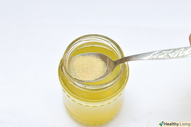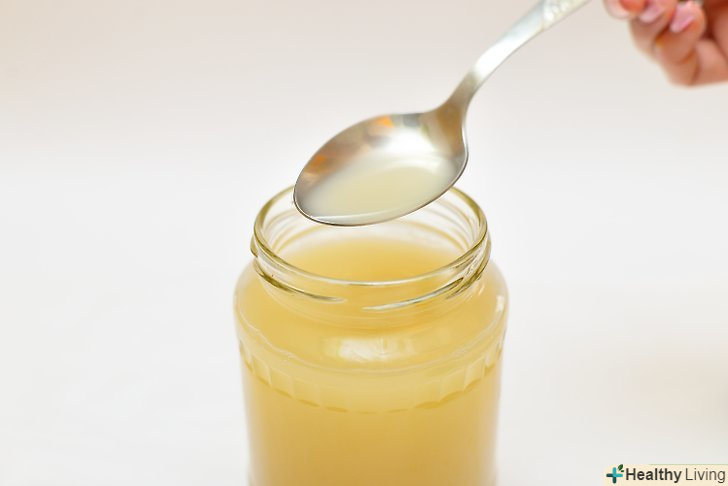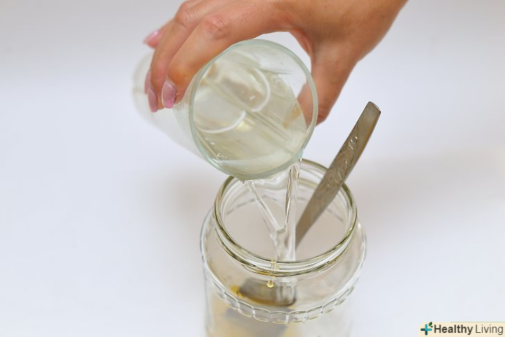 Нагрійте воду разом з медом.перемішайте обидва інгредієнти в невеликій каструлі. Поставте каструлю на плиту і нагрівайте вміст на слабкому вогні.[3]- Перемішайте мед і воду і нагрійте. Продовжуйте помішувати до тих пір, поки мед не розчиниться повністю. Суміш повинна виглядати густою і однорідною.