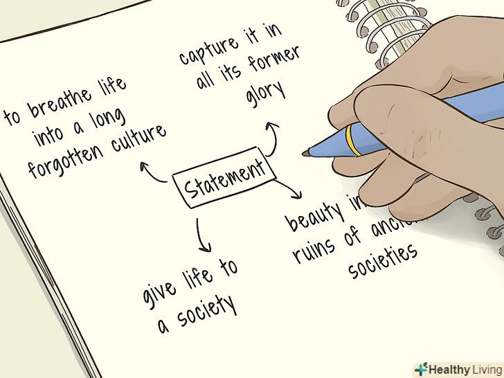 Створіть Вашу асоціативну карту.створення такої карти сприяє польоту думки і допоможе вам зв'язати всі ці думки в єдине ціле.- У центрі порожньої сторінки напишіть основну думку, яка червоною ниткою проходить крізь всю вашу роботу. Потім, витратьте 15 хвилин на те, щоб записати будь-які слова, фрази, почуття, методи і так далі., пов'язані з цією думкою.