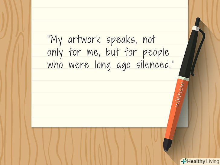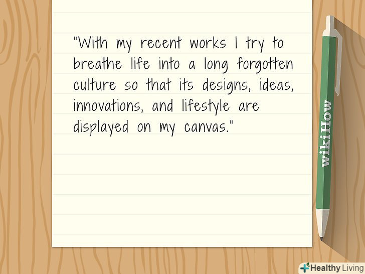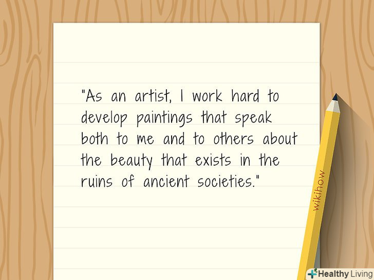 Будьте короткі, презентабельні і конкретні. Ваша заява художника являє собою передмову до вашої роботи, її короткий аналіз. Воно повинно бути розкрито в одному або двох параграфах і не перевищувати за обсягом одну сторінку.- Ваша заява повинна відповісти на найбільш поширені запитання про об'єкт вашої творчості. Чи не перенасичуйте текст зайвими фактами і подробицями.