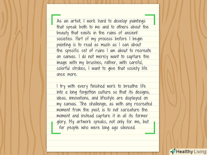 - Не всі художники можуть писати добре. Якщо ви належите до цієї категорії, подумайте про те, щоб скористатися послугами професійного письменника або редактора, бажано знайомого зі світом мистецтва, щоб допомогти вам передати те, що ви хочете, на мові, використовуваній в повсякденному спілкуванні.