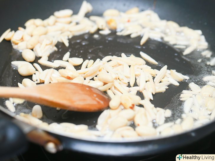 Покладіть арахіс і мигдаль на сковороду.обсмажте їх в жирі, не забуваючи часто помішувати, поки вони не стануть золотисто-коричневими. Це повинно зайняти близько 5 хвилин.[1]