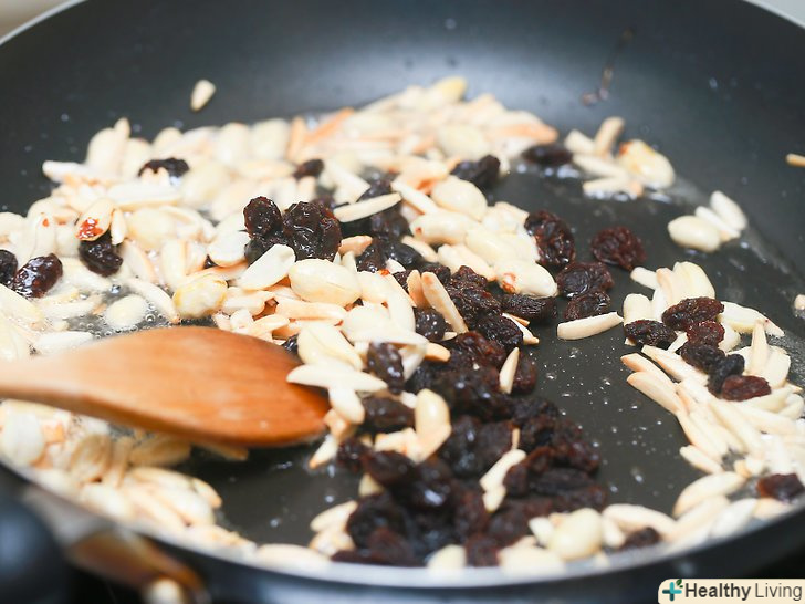Додайте родзинки.обсмажте родзинки разом з горіхами близько однієї хвилини, поки він не стане м'яким.