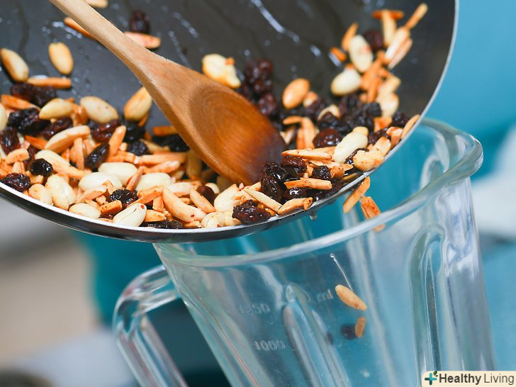 Приберіть сковороду з вогню і висипте горіхи і родзинки в блендер.