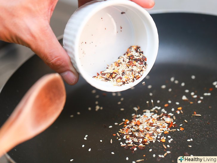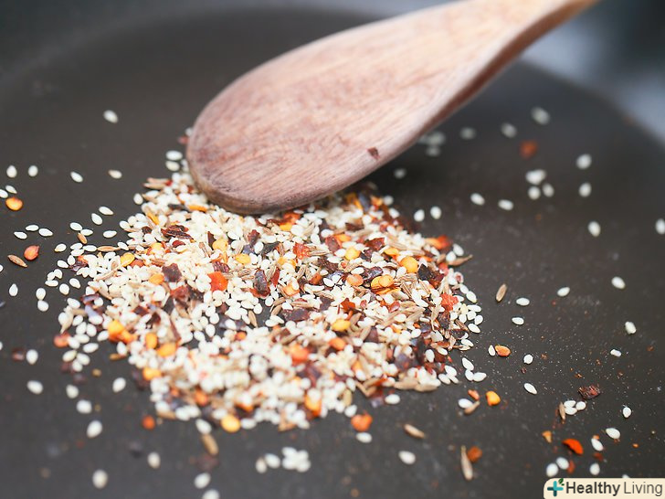 Викладіть на сковороду спеції.додайте корицю, цільно-зернові насіння кмину, насіння кропу, стружку червоного перцю і насіння кунжуту.