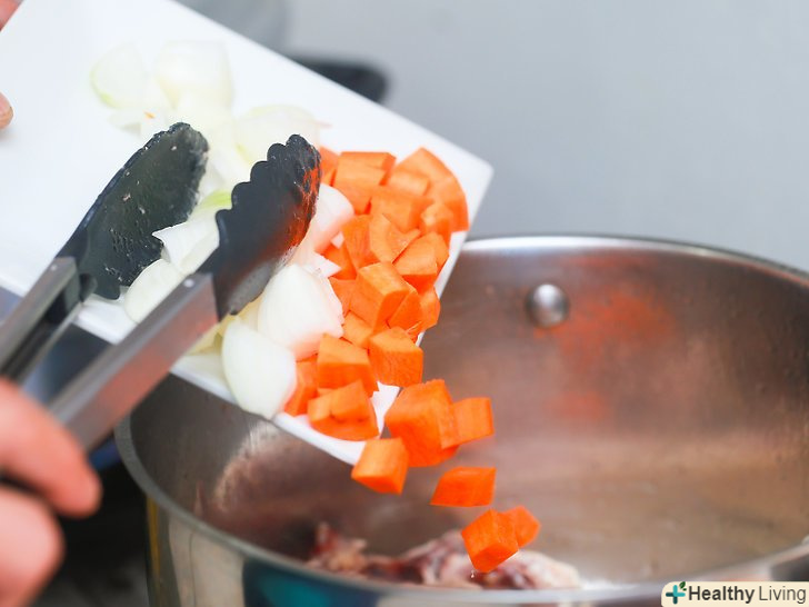 Наріжте моркву і цибулю.Грубо наріжте овочі і покладіть їх в каструлю.