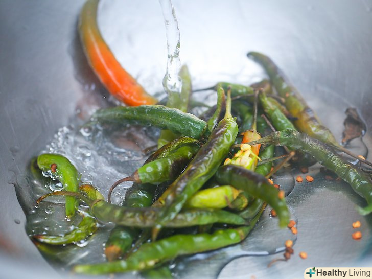 - Обов'язково прокип'ятіть перець і змийте цвіль, яка могла залишитися на кожному з них. Хоча цвіль і не представляє великої проблеми для здоров'я, вона все ж може бути дуже токсичною. Зазвичай перець добре переносить окріп, тому після кип'ятіння дуже важливо виливати окріп і обережно перенести перець у воду з льодом.