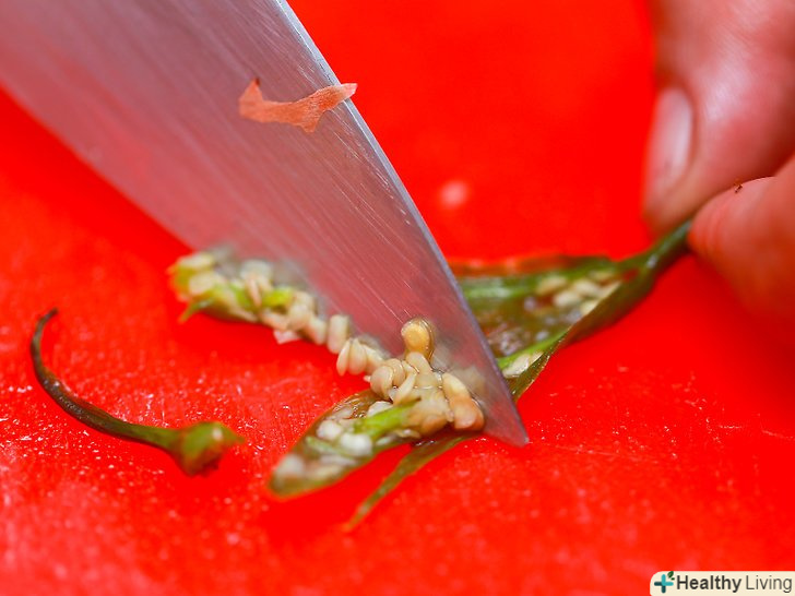 Видаліть насіння і ніжки. Видаліть з перцю ніжки. Розріжте перець в довжину і видаліть насіння. Поверніть перець назад в миску з водою, яка тепер має якийсь перцевий смак.
