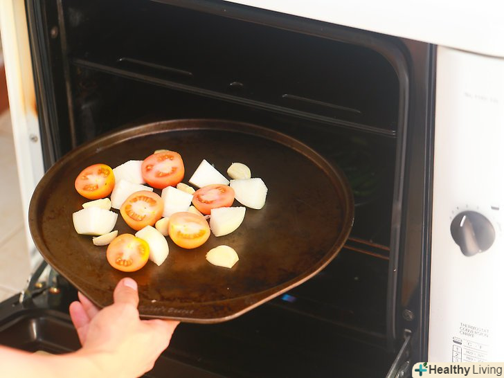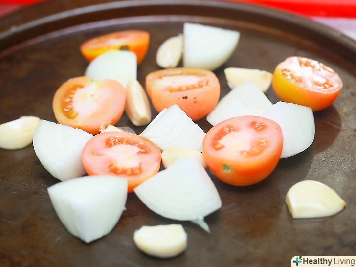 Приготуйте овочі.наріжте помідори і цибулю, почистіть часник і викладіть їх на деко.