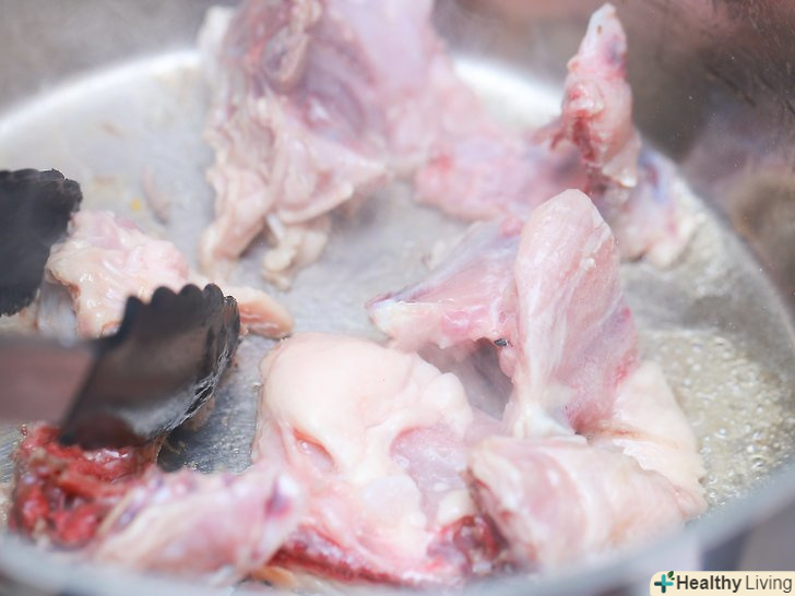 Підсмажте на олії 2 курячі грудинки.покладіть їх в каструлю і залиште їх смажитися приблизно на 3 хвилини до утворення золотистої скоринки. Через три хвилини переверніть курку, щоб вона присмажилася і з іншого боку.