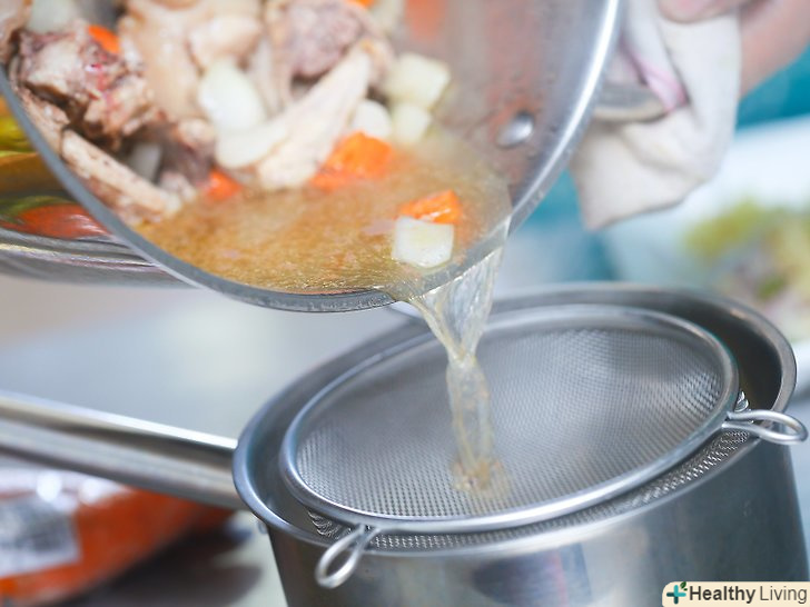 Вилийте бульйон в миску.злийте бульйон через друшляк в миску. Приберіть курку і овочі.