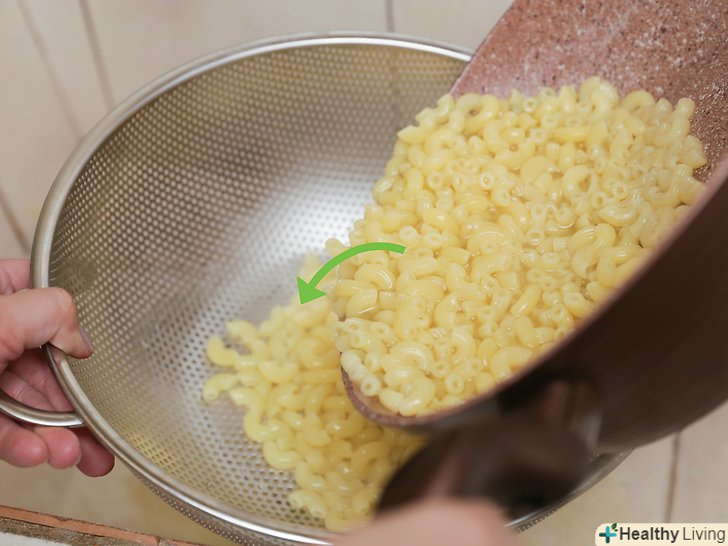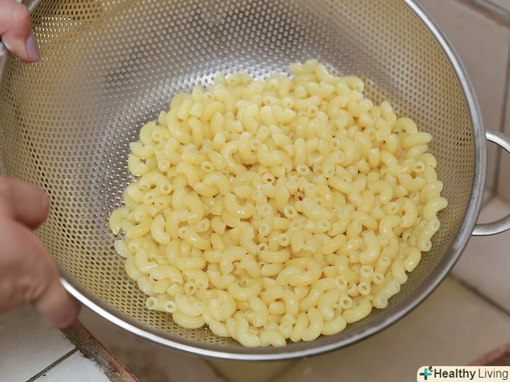 Злийте воду і поки відставте макарони в сторону.помістіть в раковину велике сито або друшляк і вилийте в нього вміст каструлі. Злегка потрусіть сито або друшляк, щоб в ньому залишилося якомога менше води.