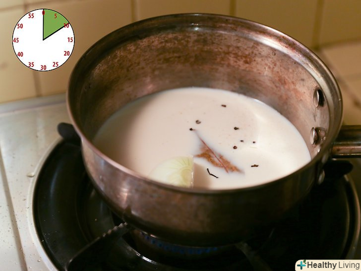 Варіть молоко з приправами на слабо-середньому вогні, поки воно не почне закипати (близько 10 хвилин).налийте молоко в сотейник і додайте часник, лавровий лист, чебрець і гірчичний порошок. Розріжте цибулину середнього розміру навпіл, застроміть в неї бутон сушеної гвоздики і також додайте в молоко. Періодично помішуючи, нагрівайте молоко, поки воно не почне закипати.- Другу половину цибулини залиште для іншого рецепта.