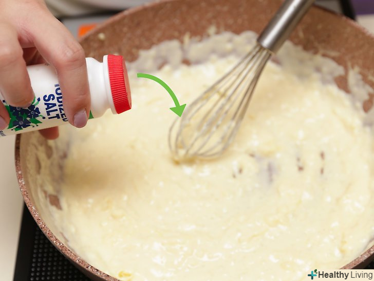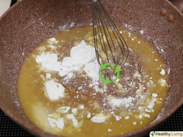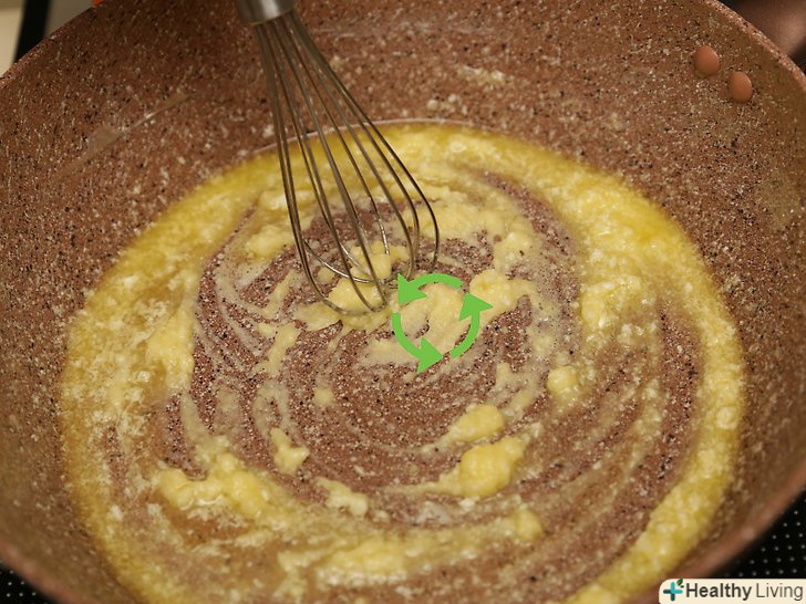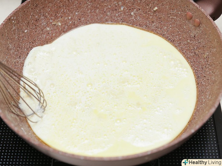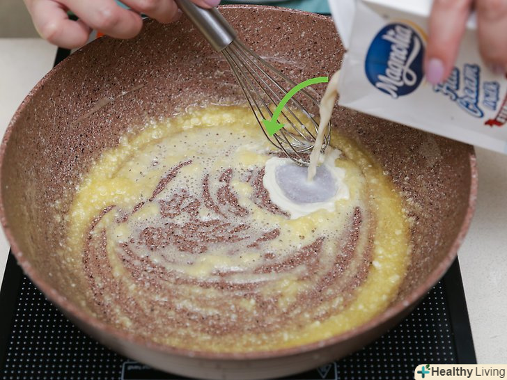 Вмішайте молоко, додаючи його невеликими порціями.налийте в сковороду 1 чашку (240 мл) молока і за допомогою віночка змішайте його з борошном і маслом. Потім додайте в суміш молоко, що залишилося і змішайте його з іншими інгредієнтами.[4] переконайтеся, що в суміші не залишилося грудочок борошна.[5]