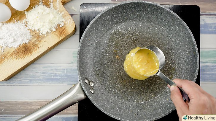 - Розігрійте велику сковороду з антипригарним покриттям на слабкому вогні, додайте масло.візьміть велику сковороду з антипригарним покриттям і поставте її на конфорку відповідного розміру. Змастіть сковороду рослинним маслом (кокосовим або іншим). Також можна використовувати розтоплене вершкове масло, якщо ви хочете отримати більш ситні панкейки. Дайте сковороді нагрітися протягом 1-2 хвилин.[13]