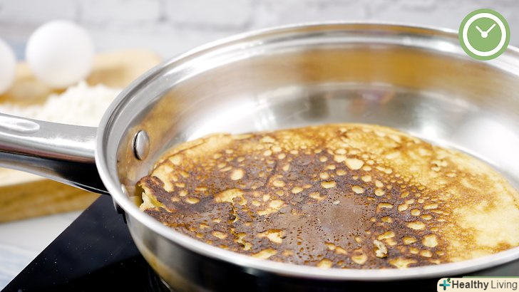 - Смажте панкейки приблизно 1,5-2 хвилини на кожній стороні.обсмажуйте панкейки як мінімум 1,5 хвилини з кожного боку. Коли тісто по краях почне ставати коричневим, підчепіть кожен панкейк знизу лопаткою і переверніть на іншу сторону. Смажте панкейки з другої сторони стільки ж, скільки і з першої.[16]