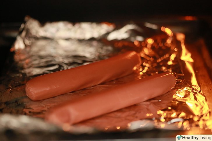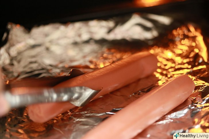 Готуйте сосиски близько 15 хвилин.поставте таймер, щоб не забути вчасно вимкнути духовку. Через 15 хвилин відкрийте духовку і перевірте, чи готові сосиски. Якщо сосиски потемніли, а краю надрізів злегка відігнулися, можна класти сосиски в булочки. Якщо ні, залиште їх в духовці ще на кілька хвилин.[3]- Якщо ви хочете, щоб у сосисок була більш темна і хрустка скоринка, переключіть режим духовки на гриль на останні 2-3 хвилини приготування.