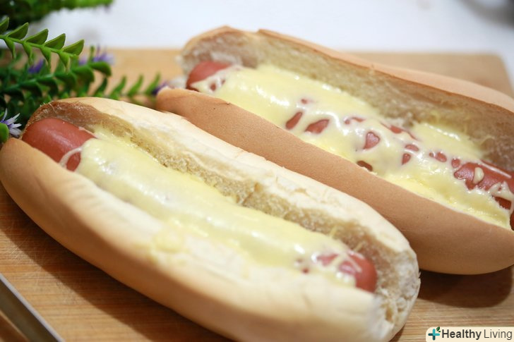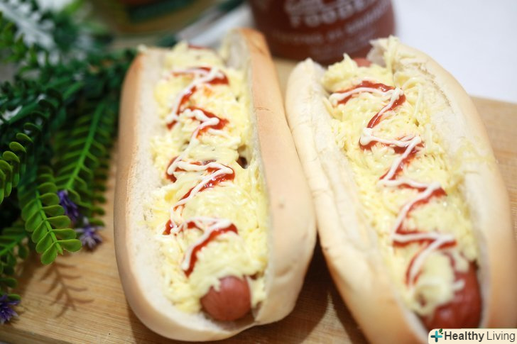 Вийміть сосиски з духовки і приготуйте хот-доги.за допомогою лопатки викладіть готові сосиски на тарілку. Покладіть їх в булочки для хот-догів і додайте соуси і додаткові інгредієнти на свій смак, наприклад сир, гірчицю, кетчуп або майонез.[4]- Якщо ви хочете приготувати хот-доги з розплавленим сиром, покладіть сир поверх сосисок і поставте в духовку на 1 хвилину.