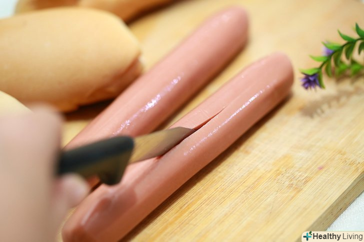 За допомогою ножа зробіть на сосисках надрізи по всій довжині.вони повинні бути досить глибокими, але не настільки, щоб сосиска була розрізана навпіл. Ріжте від одного кінця сосиски до іншого.[2]