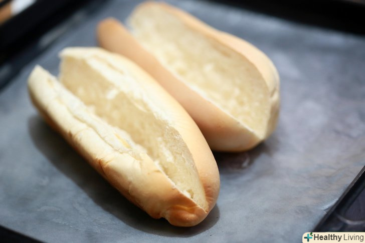 Розкладіть булочки для хот-догів у формі для запікання.При цьому вони повинні стосуватися один одного. Краще, якщо булочки будуть досить щільно прилягати один до одного — так жодна з них не перевернеться при запіканні. Для кожного хот-дога потрібна одна булочка.[6]- Щоб хот-доги були смачніше, змастіть внутрішню частину булочок вершковим маслом або майонезом, перш ніж викладати їх у форму.