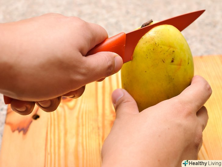 - Переверніть бічну сторону манго і зніміть шкуру.