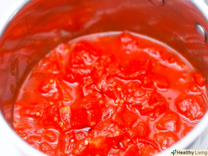 Додайте в сковороду подрібнений часник, дрібно нарізану цибулю, помідори (без рідини) і базилік.посоліть і поперчіть свіжомеленим чорним перцем за смаком. Доведіть до легкого кипіння. Готуйте протягом приблизно 5 хвилин, потім зніміть з вогню.