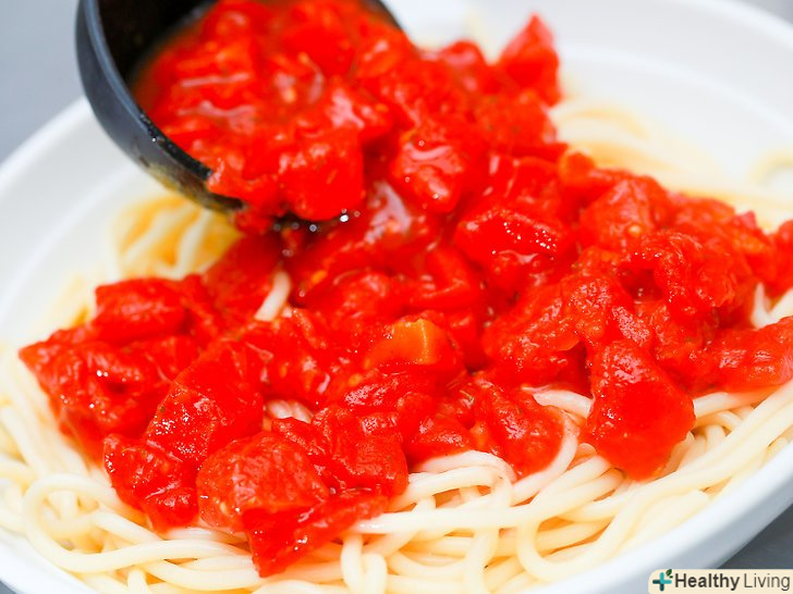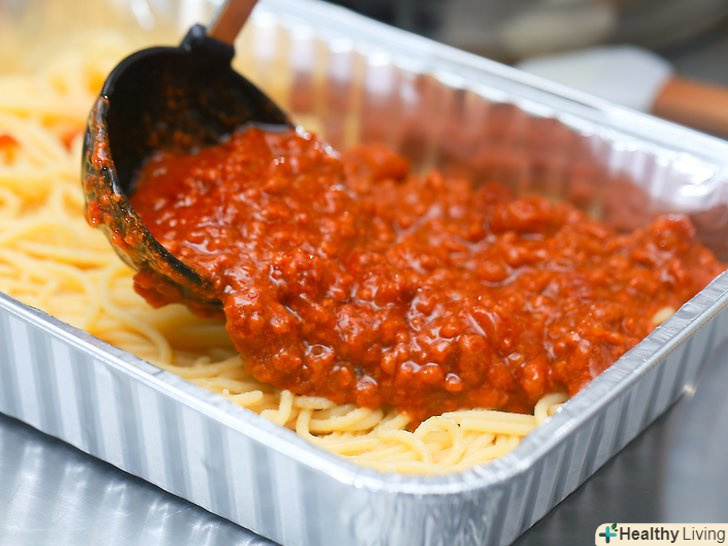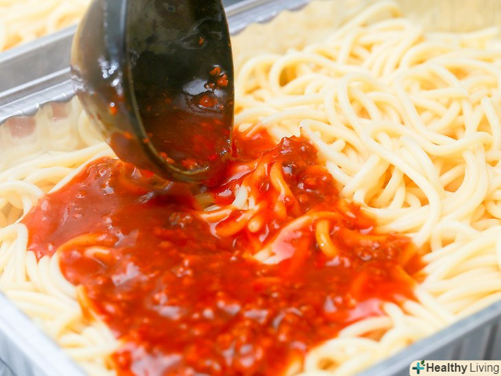 Налийте томатний соус.вам буде потрібно не менше половини пляшки соусу для макаронів, щоб покрити спагетті. Додавайте соус на свій розсуд. Ретельно перемішайте. Посоліть і поперчіть свіжомеленим перцем.