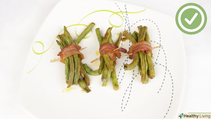 - Візьміть пучок квасолі і оберніть шматком бекону.закріпіть бекон зубочисткою і покладіть на тарілку. Продовжуйте брати квасолю пучками, обмотувати беконом і закріплювати зубочисткою, поки вся квасоля і весь бекон не будуть використані.