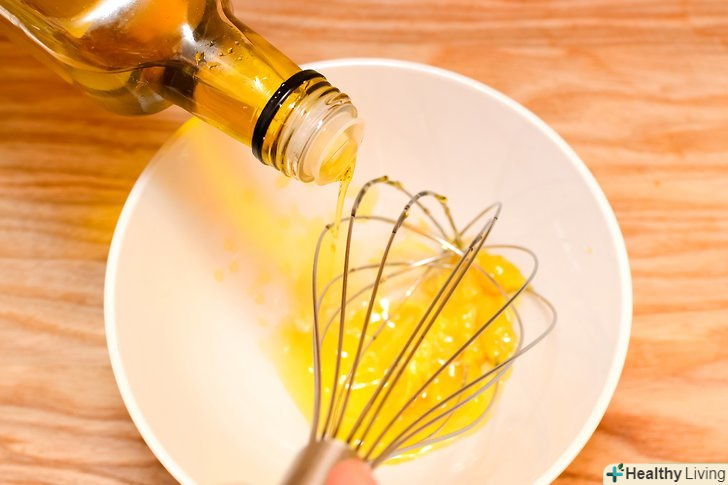 Додайте оливкову олію.щоб правильно поєднувати всі інгредієнти, продовжуйте збивати лимонну суміш, повільно вливаючи оливкову олію. Збивання при наливанні масла, допоможе водній основі лимонного соку з'єднатися з маслом. Продовжуйте збивати, поки всі інгредієнти ретельно не перемішаються.